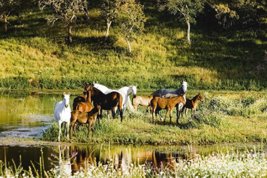 Vous rêvez d'une immersion en pleine nature digne d'un lodge de safari mais à 2h de chez vous ? Direction le Portugal et ce domaine magnifique de 250 hectares dans l'Alentejo ! L'arrivée sur une piste de terre au milieu d'une savane ponctuée de chênes lièges et de chênes verts rappelle irrésistiblement la savane africaine. On s'attend à voir surgir une girafe derrière la voûte en parasol d'un chêne vert. Et lorsque vous découvrez le lodge qui vous accueille, avec ses manèges et carrières de dressage impeccables, la fusion est parfaite entre le meilleur des deux mondes : la tradition équestre portugaise et le privilège d'être au coeur d'une nature sauvage et préservée. Ce domaine d'exception est aussi un élevage de chevaux lusitaniens de très haut niveau, ayant donné naissance à des chevaux olympiques, dont les juments et poulains vivent en liberté. Vous aurez souvent l'occasion de les voir près du lac que surplombe le lodge. |