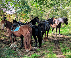 Une petite cavalerie composée principalement d'Irish Cobs, de Welsh et de chevaux ibériques, habitués à la randonnée équestre. Certains chevaux seront en licol éthologique, et une bonne part d'entre eux évolue en "pieds nus". |