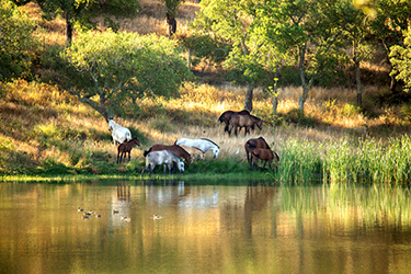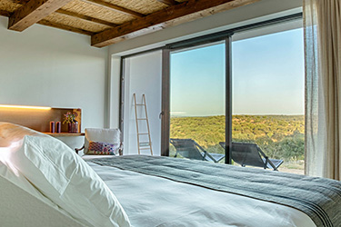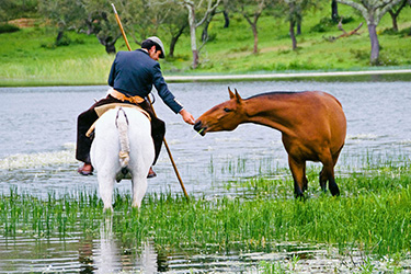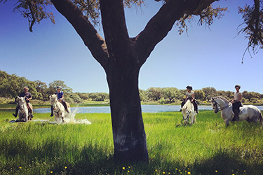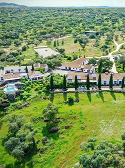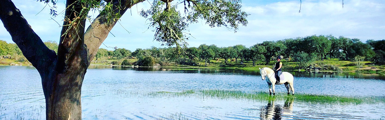 Vous rêvez d'une immersion en pleine nature digne d'un lodge de safari mais à 2h de chez vous ? Direction le Portugal et ce domaine magnifique de 250 hectares dans l'Alentejo ! L'arrivée sur une piste de terre au milieu d'une savane ponctuée de chênes lièges et de chênes verts rappelle irrésistiblement la savane africaine. On s'attend à voir surgir une girafe derrière la voûte en parasol d'un chêne vert. Et lorsque vous découvrez le lodge qui vous accueille, avec ses manèges et carrières de dressage impeccables, la fusion est parfaite entre le meilleur des deux mondes : la tradition équestre portugaise et le privilège d'être au coeur d'une nature sauvage et préservée. Ce domaine d'exception est aussi un élevage de chevaux lusitaniens de très haut niveau, ayant donné naissance à des chevaux olympiques, dont les juments et poulains vivent en liberté. Vous aurez souvent l'occasion de les voir près du lac que surplombe le lodge. |