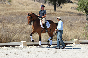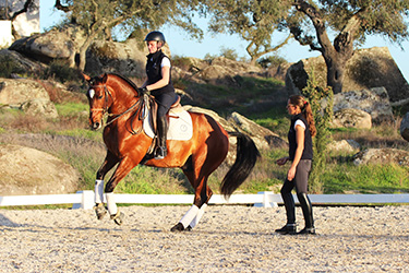 Tous les moniteurs participent à des compétitions de dressage avec les chevaux de l'élevage et suivent régulièrement des formations auprès des entraîneurs les plus renommés au monde. Joao, cavalier olympique est très souvent présent sur le site puisqu'il entraine ici son nouveau cheval de compétition. Il propose régulièrement des masterclass. Bernardo est l'illustration parfaite de la connexion entre instructeur et cavalier. |